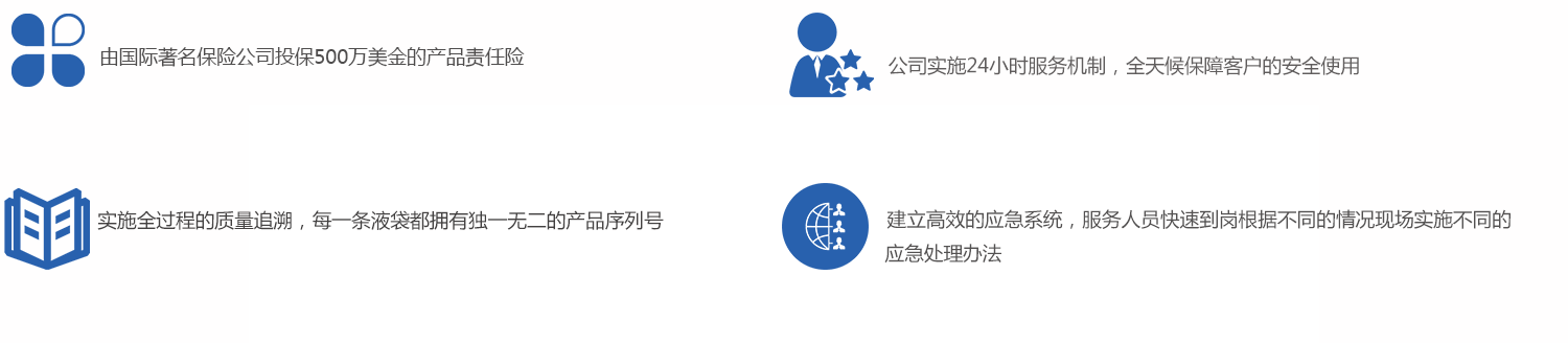 青島普瑞德包裝材料有限公司生產(chǎn)的液袋均由國際著名保險公司投保產(chǎn)品責任險,我司承諾凡是因我司液袋產(chǎn)品質(zhì)量問題造成的貨值損失,單次賠付金額高達500萬美金,最大化的保護了我司客戶的利益,為進一步保障安全使用,公司實施24小時服務機制,建立高效,快速的應急系統(tǒng),處理產(chǎn)品使用過程中的各種突發(fā)意外事件,根據(jù)不同的情況現(xiàn)場實施不同的應急處理辦法,可以在全球各個地區(qū)提供事故理賠服務,全天候保障客戶安全使用,為顧客免除后顧之憂。